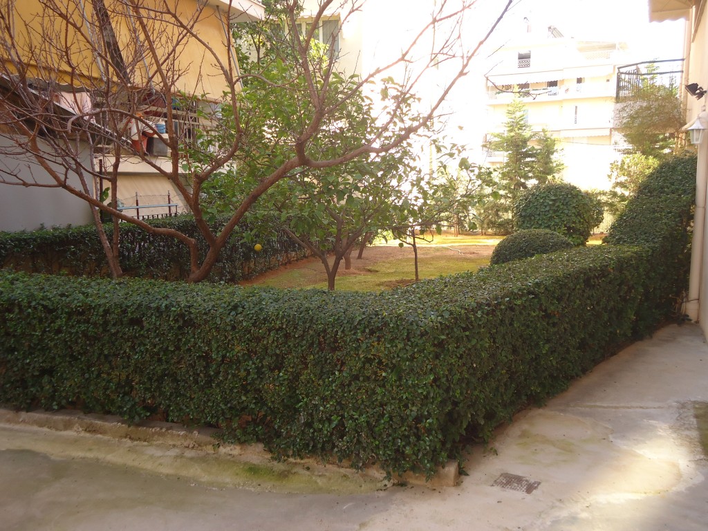 Αναλάβαμε τη συντήρηση ενός ξεχωριστού κήπου στον Άγιο Δημήτριο. Πρωταρχικής σημασίας η διατήρηση της ευρωστίας και του σχήματος σε τρία Λεμονοκυπάρισσα (Gold crest) και η βελτίωση του παραμελημένου χλοοτάπητα, στόχος που επετεύχθη με επισπορά. Στο πίσω μέρος του κήπου συμβιώνουν αρμονικά καρποφόρα δένδρα, καλλωπιστικοί θάμνοι και αναρριχώμενα φυτά.