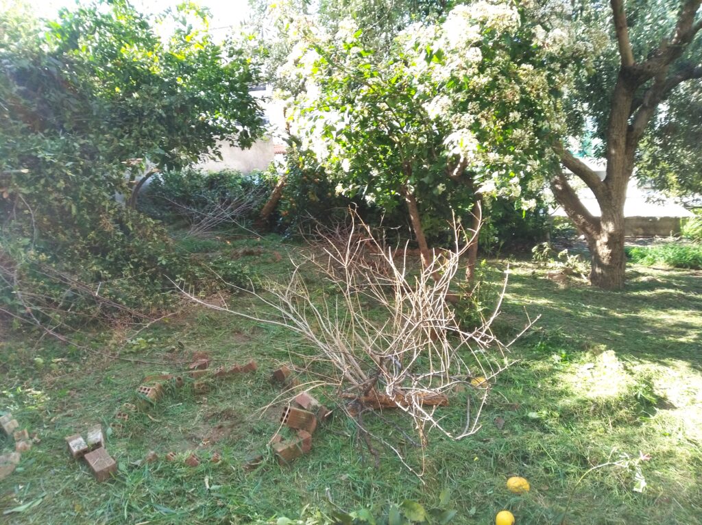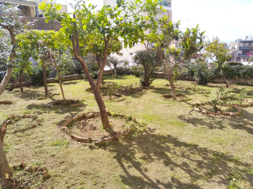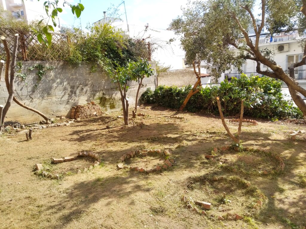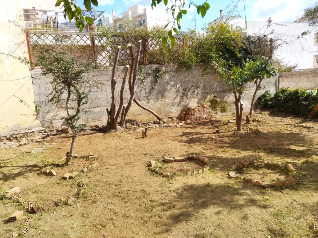 Οικόπεδο στο πίσω μέρος πολυκατοικίας στην Ηλιούπολη στο οποίο φιλοξενούνται πολλά δένδρα, κυρίως εσπεριδοειδή αλλά και Ροδιές, Ελιά, Φίκος ελαστικοφόρος, Βουκαμβίλλια. Ακόμη υπάρχουν διάφοροι θάμνοι όπως Πυράκανθος, Πικροδάφνη, Βιβούρνο, Δάφνη Απόλλωνος και Τριανταφυλλιές. Το κλάδεμα των δένδρων δύσκολο λόγο των πολλών ετών που τα δένδρα είχαν να κλαδευτούν. Συνέπεια αυτού η απομάκρυνση από το χώρο μεγάλου όγκου φυτικής ύλης. Επιπλέον έγινε αποψίλωση και καθαρισμός της επιφάνειας του εδάφους.