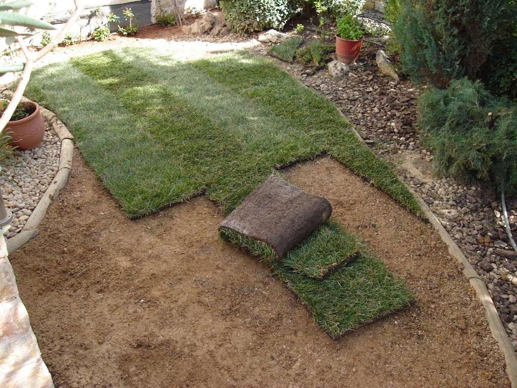 Αφαίρεση του παλαιού κατεστραμμένου χλοοτάπητα σε μικρό κήπο στο Γέρακα Αττικής. Δημιουργία αποστραγγιστικού δικτύου και εγκατάσταση έτοιμου χλοοτάπητα.
