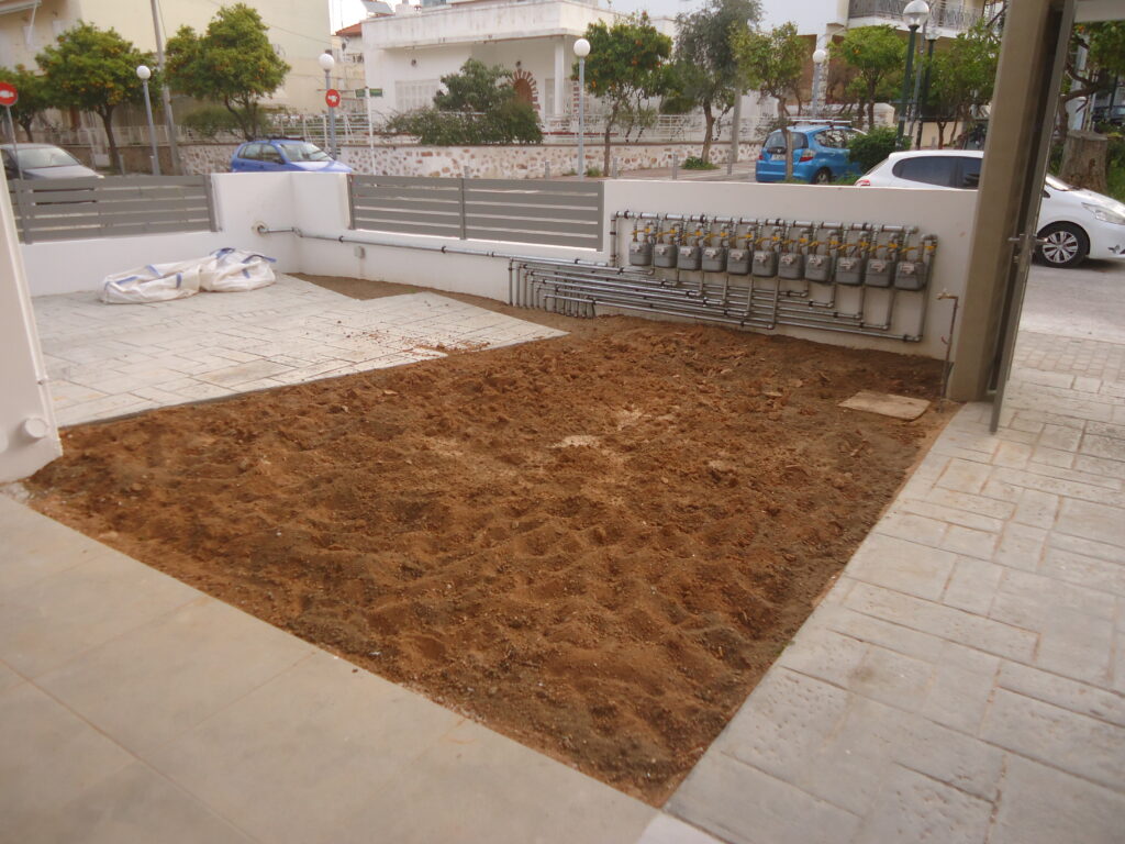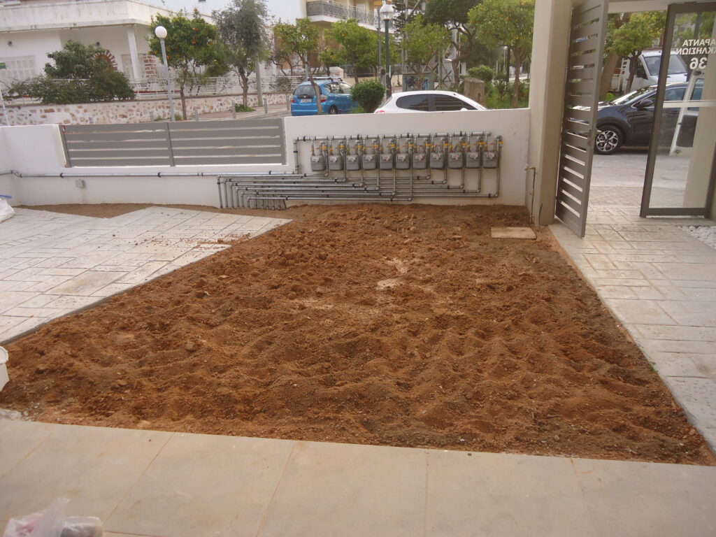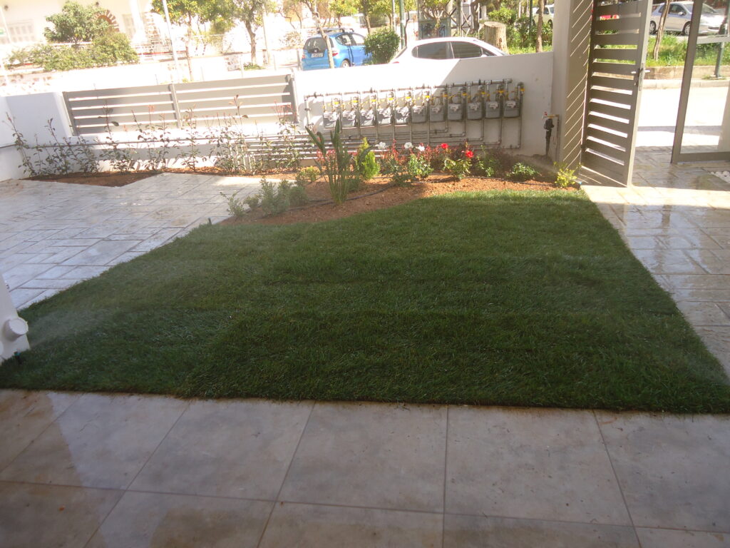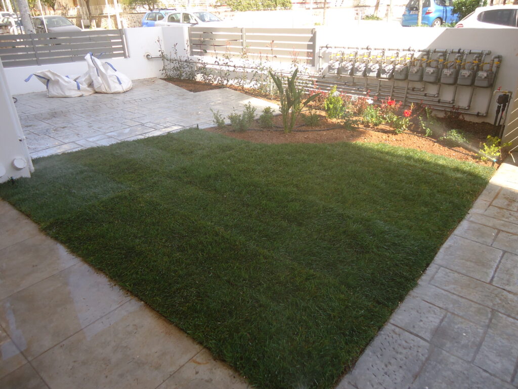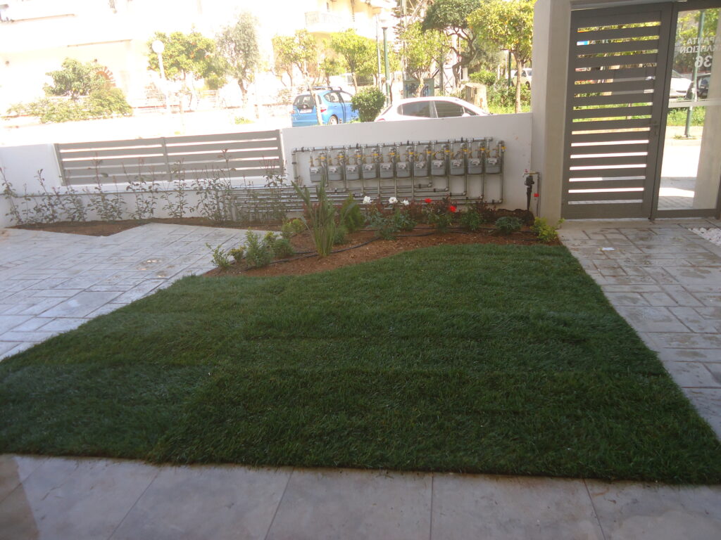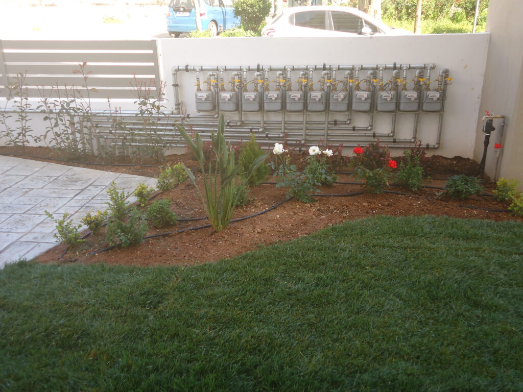Στόχος μας η δημιουργία ενός μικρού κήπου ο οποίος ομορφαίνει την είσοδο της πολυκατοικίας. Τα φυτά που επιλέχθηκαν είναι ανθοφόρα όπως Τριανταφυλλιές, Σάλβια κόκκινη και Στρελίτζια. Για τη δημιουργία μπορντούρας στο πίσω μέρος χρησιμοποιήθηκε Φωτίνια η οποία ομορφαίνει το χώρο με τα πανέμορφα κόκκινα νεοεμφανιζόμενά της φύλλα. Τα πανέμορφα μικρά μας φυτά συνοδεύονται από καταπράσινο χλοοτάπητα στον οποίο έχει γίνει εγκατάσταση αυτόματου υπόγειου αρδευτικού συστήματος. Περιφερειακά της πολυκατοικίας έγινε φύτευση Λιγούστρων, τα οποία συνυπάρχουν με πανέμορφα Τούγια.