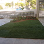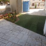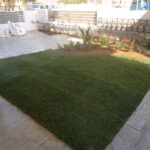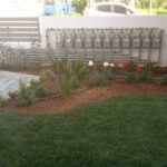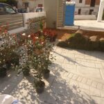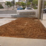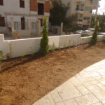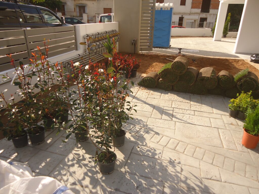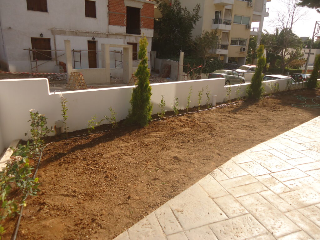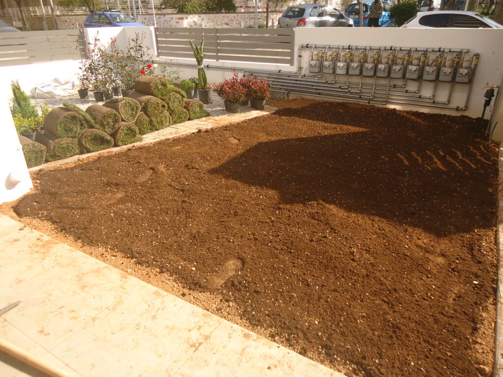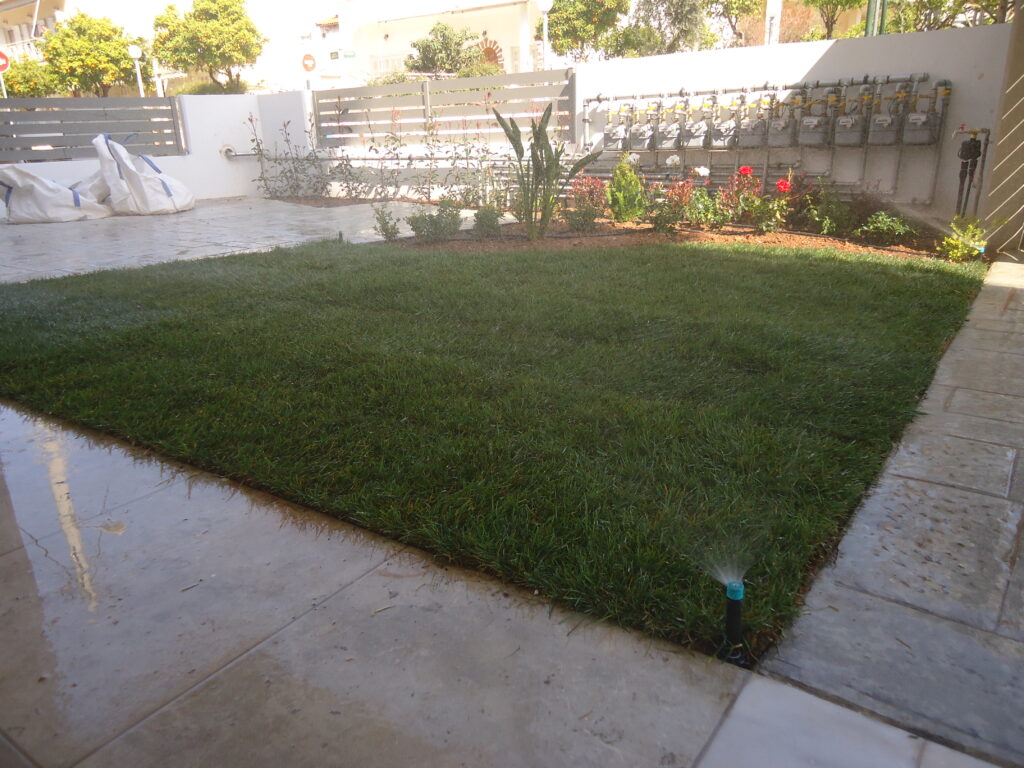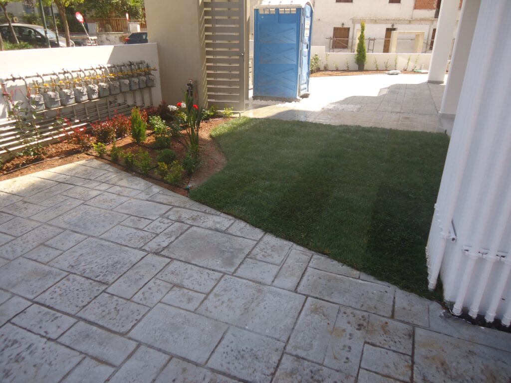 Στόχος μας η δημιουργία ενός μικρού κήπου ο οποίος ομορφαίνει την είσοδο της πολυκατοικίας. Τα φυτά που επιλέχθηκαν είναι ανθοφόρα όπως Τριανταφυλλιές, Σάλβια κόκκινη και Στρελίτζια. Για τη δημιουργία μπορντούρας στο πίσω μέρος χρησιμοποιήθηκε Φωτίνια η οποία ομορφαίνει το χώρο με τα πανέμορφα κόκκινα νεοεμφανιζόμενά της φύλλα. Τα πανέμορφα μικρά μας φυτά συνοδεύονται από καταπράσινο χλοοτάπητα στον οποίο έχει γίνει εγκατάσταση αυτόματου υπόγειου αρδευτικού συστήματος. Περιφερειακά της πολυκατοικίας έγινε φύτευση Λιγούστρων, τα οποία συνυπάρχουν με πανέμορφα Τούγια.