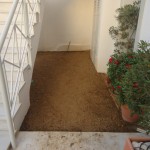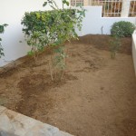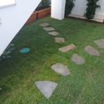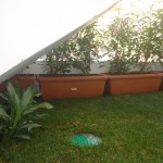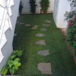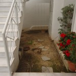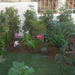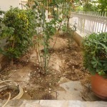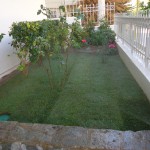 Έντονος ο αρχικός προβληματισμός σχετικά με τη γραμμή που θα ακολουθήσουμε στο σχεδιασμό του συγκεκριμένου κήπου. Από τη μία πλευρά καταλήξαμε στη δημιουργία ενός βραχόκηπου δίπλα στην προϋπάρχουσα μπορντούρα Βιβούρνου και στη φύτευση της υπόλοιπης έκτασης με έτοιμο χλοοτάπητα, ανθεκτικού σε σκιερές συνθήκες. Στο απέναντι κομμάτι του κήπου, αριστερά της εισόδου, κυρίαρχο στοιχείο πάλι ο χλοοτάπητας με τη χρήση μονοπατιών από πλάκες Καρύστου. Στο συγκεκριμένο κομμάτι έγινε χρήση τεσσάρων μεγάλων ζαρντινιερών για δημιουργία μπορντούρας από Φωτίνιες στην πρόσοψη, μιας και εκεί δεν ήταν δυνατή η φύτευσή τους στο έδαφος λόγω ύπαρξης μεγάλου όγκου μπετού. Σε όλο τον κήπο έγινε εγκατάσταση υπόγειου συστήματος άρδευσης με πρόβλεψη να ποτίζονται σε ξεχωριστή αρδευτική ζώνη τα φυτά σε γλάστρες, τόσο περιφερειακά του χλοοτάπητα όσο και κατά μήκος της σκάλας που οδηγεί στην είσοδο της οικίας.