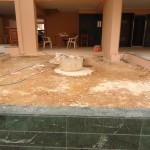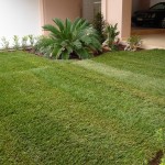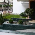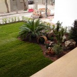 Δόθηκε έμφαση στη δημιουργία ενός πανέμορφου μικρού βραχόκηπου πλαισιωμένου από γκαζόν. Φύτευση θάμνων και λιγοστών δένδρων σε παρτέρι στον ακάλυπτο χώρο της πολυκατοικίας με εγκατάσταση αυτόματου ποτίσματος. Χρησιμοποιήθηκε σταλακτηφόρος σωλήνα Φ16/33 για ομοιόμορφη κατανομή του νερού στο παρτέρι και οικονομία νερού.