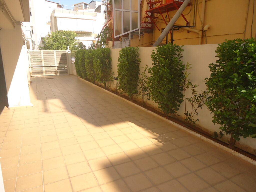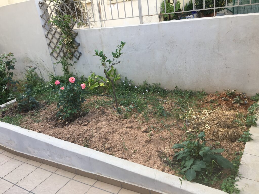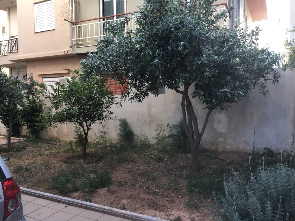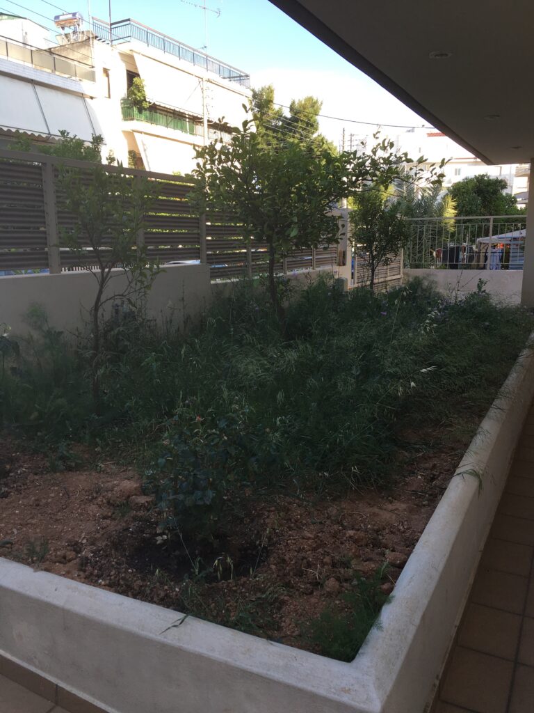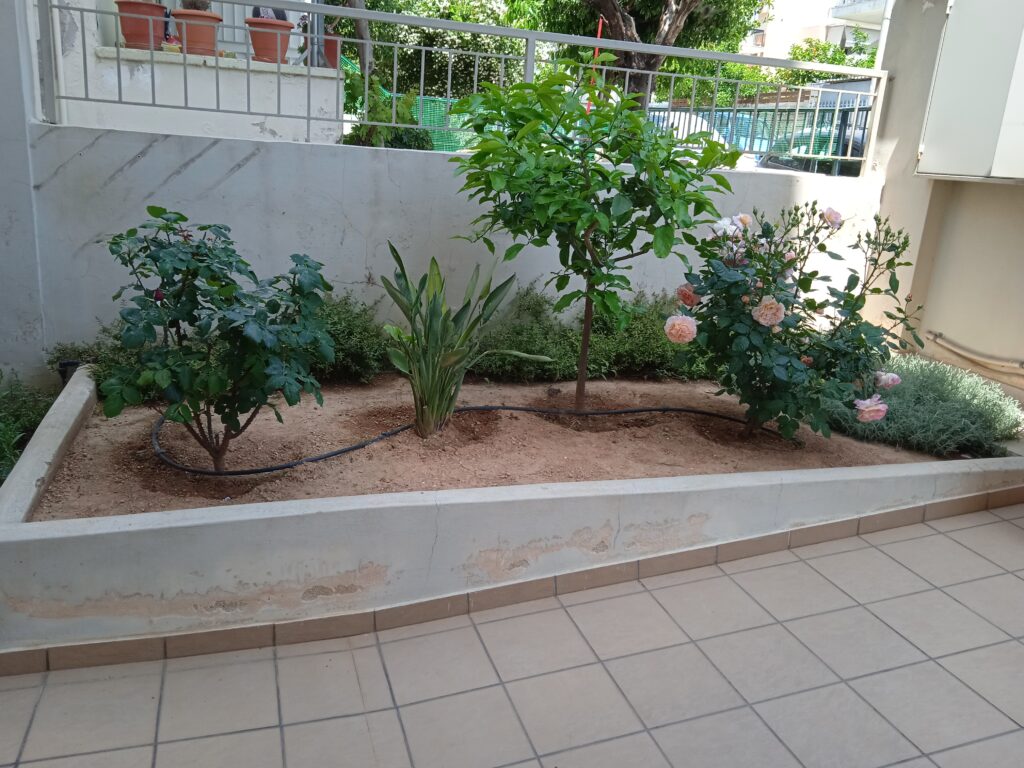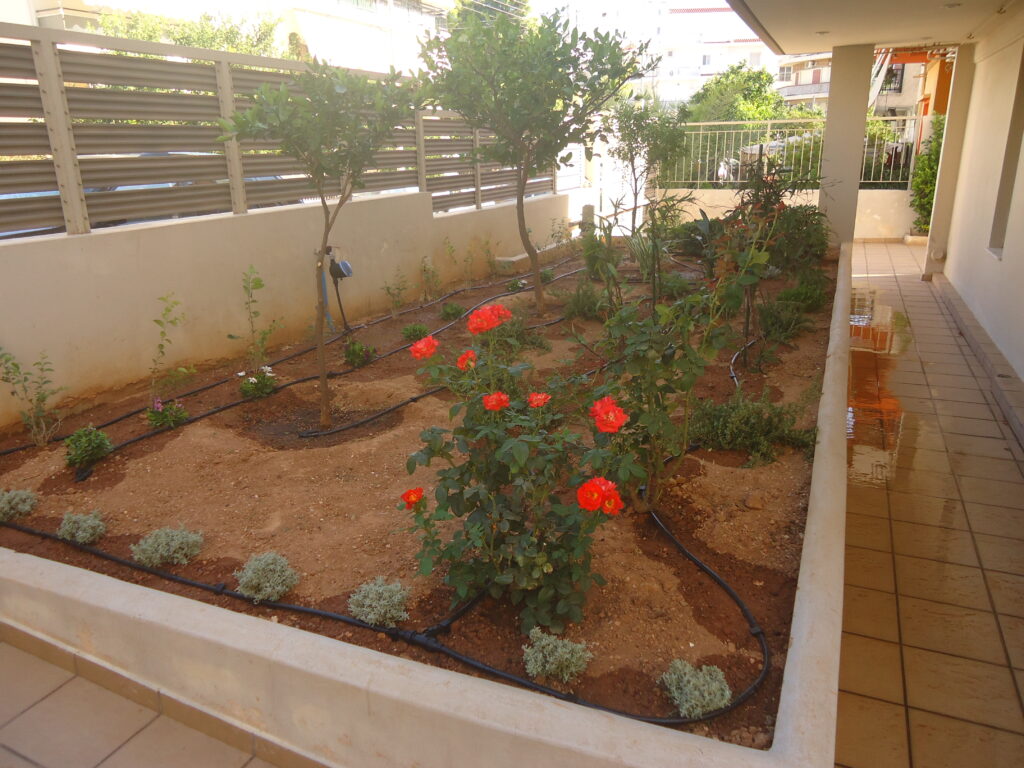 Στον περιβάλλοντα χώρο της πολυκατοικίας διατηρήθηκαν τα μικρά εσπεριδοειδή, τα οποία και πλαισιώθηκαν από άλλα ανθοφόρα και μη. Αποφασίστηκε δημιουργία μπορντούρας από Αμπέλια δεξιά της εισόδου και από Λιγούστρο αριστερά. Μπροστά από τις μπορντούρες φυτεύτηκαν πολλά ανθόφυτα όπως Διμορφοθήκες, Τριανταφυλλιές, Ρουέλια, Γκάουρα, κ.α., έρποντα φυτά όπως Δενδρολίβανο, Λαντάνα κίτρινη, Λεβαντίνη και νάνα φυτά όπως Αγγελική και Τούγια. Στην πίσω πλευρά του κτιρίου, στα κενά ανάμεσα στα θαυμάσια ψηλά Βιβούρνα που υπήρχαν, προστέθηκαν Φωτίνιες τις οποίες και περιμένουμε πλέον με ανυπομονησία να μεγαλώσουν και να ¨κοκκινίσουν¨ τον χώρο την άνοιξη με το κόκκινο νεαρό φύλλωμά τους. Εγκατάσταση αυτόματου ποτίσματος με στάγδην άρδευση σε ολόκληρο τον κήπο.