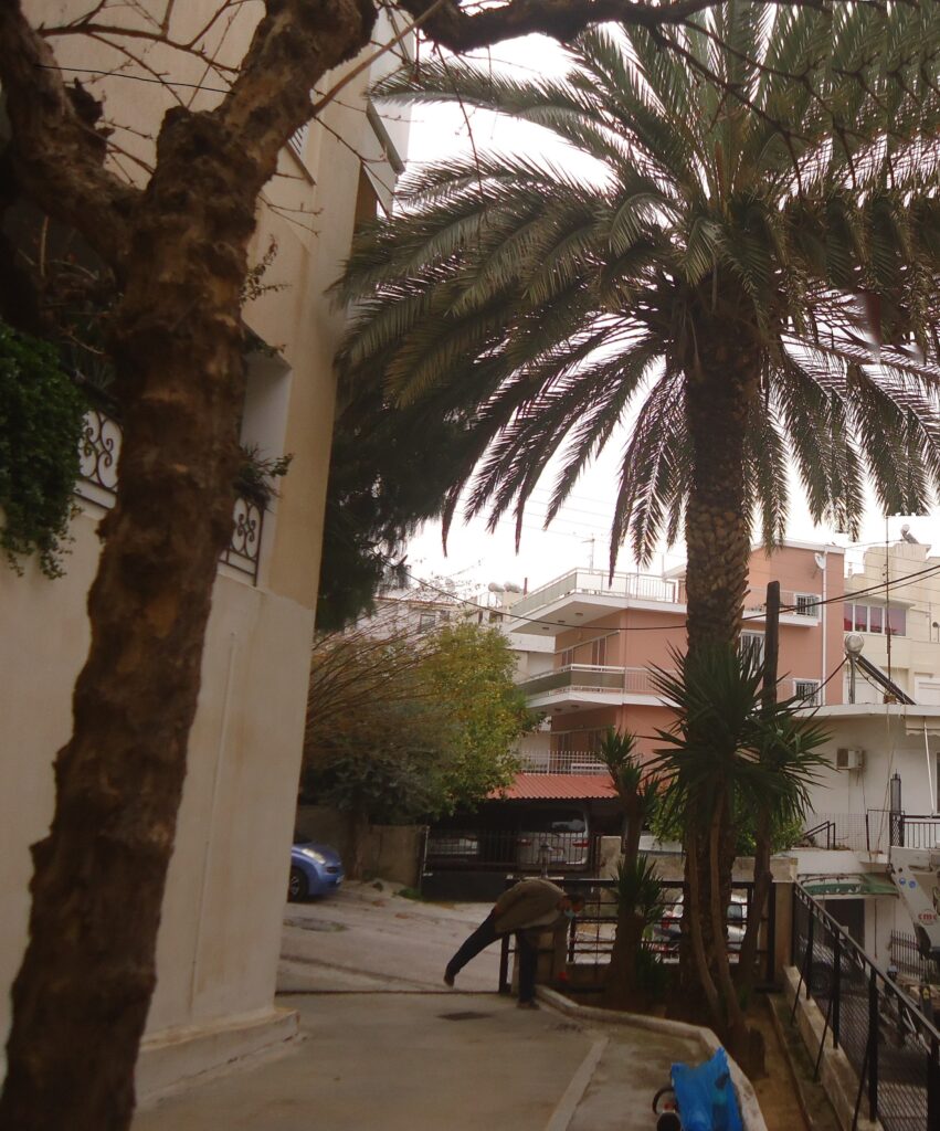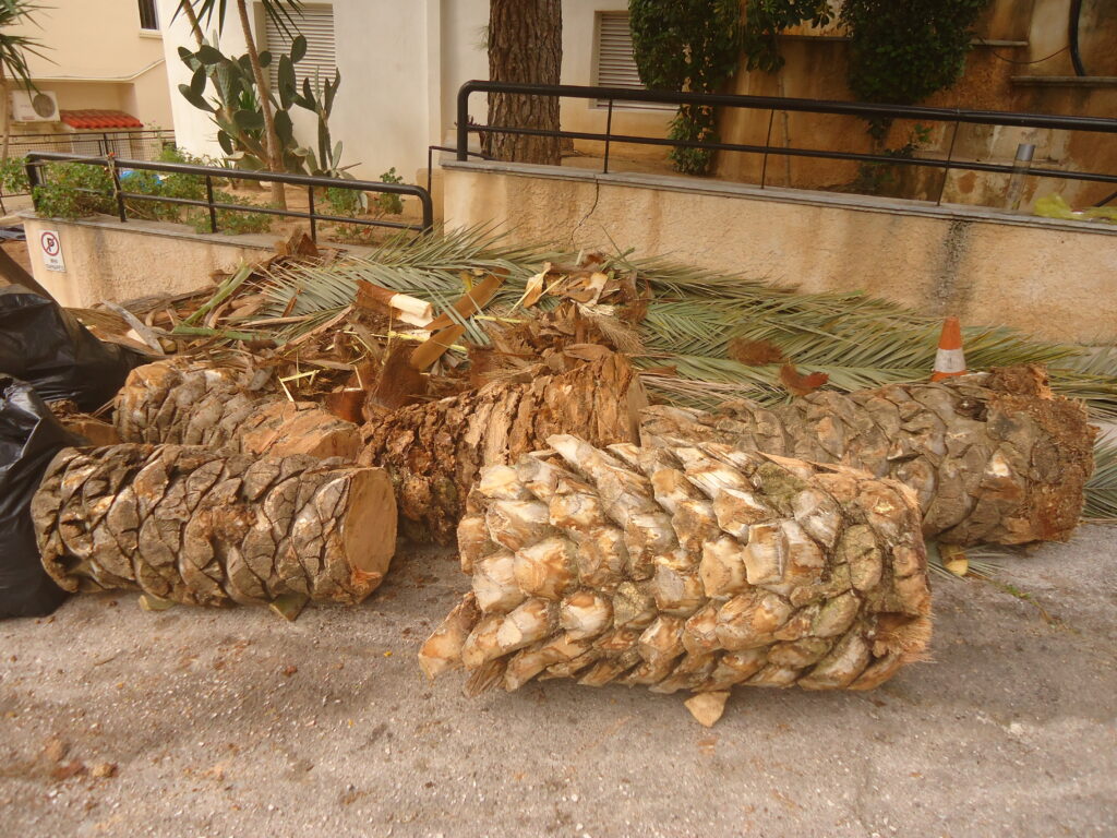 Φοίνικας σε ακάλυπτο πολυκατοικίας με εμφανής προσβολές κατά μήκος του κορμού από το έντομο Rhynchophorus ferrugineus (κόκκινος ρυγχωτός κάνθαρος ή κόκκινο σκαθάρι), ο οποίος και θεωρείται σήμερα ο σημαντικότερος εχθρός των φοινικοειδών. Ο Φοίνικας ήταν πλέον άκρως επικίνδυνος λόγω σήψης του κορμού και για το λόγο αυτό αποφασίστηκε το κόψιμο και η απομάκρυνσή του.