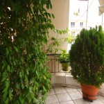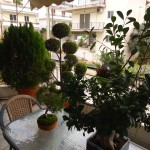 Ένα μικρό μπαλκόνι με πολλές πήλινες γλάστρες και φυτά προσεκτικά επιλεγμένα με άψογο αισθητικό αποτέλεσμα. Εγκατάσταση αυτόματου ποτίσματος με σταλακτοφόρο σωλήνα Φ6/30 και τοποθέτηση των γλαστρών σε ειδικές μεταλλικές βάσεις με ροδάκια για εύκολη μετακίνηση και γύρισμα της γλάστρας μία φορά ανά έτος. Αυτό βοηθάει στο να μην δέχεται μόνιμα τις ακτίνες του ηλίου μόνο η μία πλευρά του φυτού, διότι σε αντίθετη περίπτωση η εσωτερική του πλευρά δεν φωτοσυνθέτει επαρκώς και εμφανίζει συμπτώματα καχεξίας, αποφύλλωσης κ.λ.π. Επιπλέον, εγκαταστάθηκε σύστημα φωτισμού. Το κόστος της όλης δημιουργίας αρκετά υψηλό, γεγονός όμως μη αποτρεπτικό για τον ιδιοκτήτη.