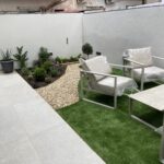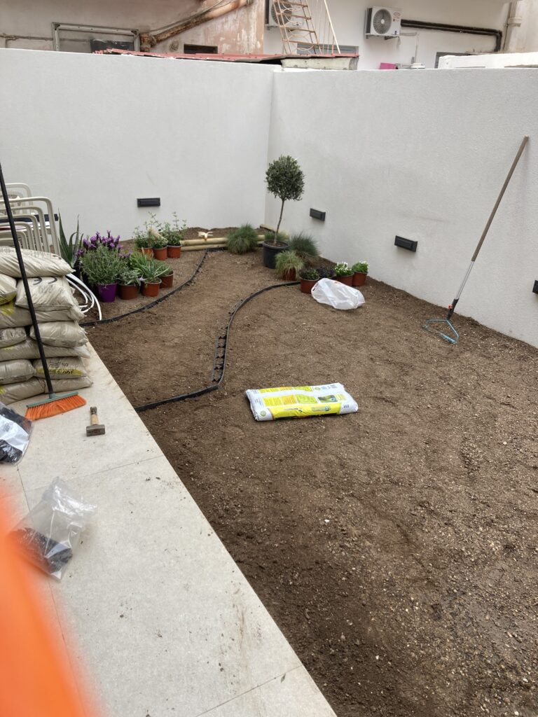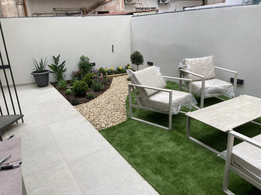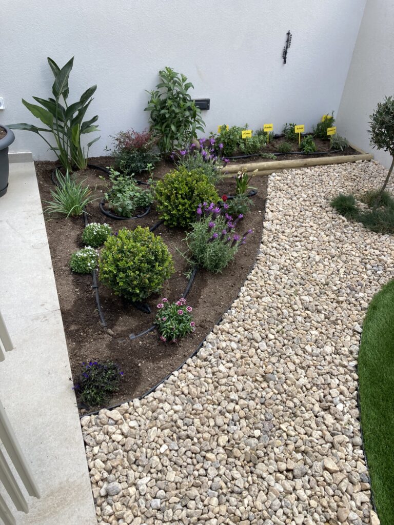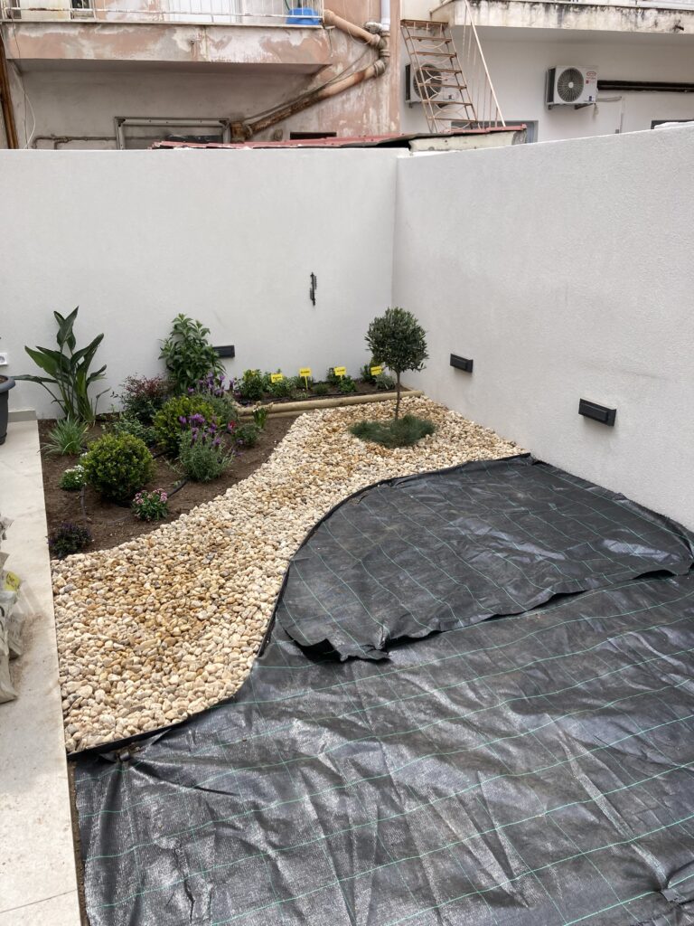 Οι διαστάσεις του κήπου μικρές, 2,8μ x 6,8μ, ωστόσο οι απαιτήσεις του ιδιοκτήτη μεγάλες για δημιουργία ενός εντυπωσιακού κήπου με τη λιγότερη δυνατή συντήρηση. Επιλέχθηκε συνθετικός χλοοτάπητας με ύψος ίνας 50mm, βότσαλο μπεζ χαλαζιακό, ανθοφόρα φυτά. Έγινε εγκατάσταση αυτόματου αρδευτικού συστήματος και επιπλέον, δημιουργήθηκε ένα μικρό υπερυψωμένο παρτέρι για την καλλιέργεια βασικών αρωματικών βοτάνων της ελληνικής κουζίνας.