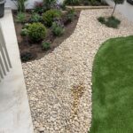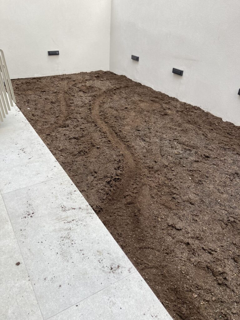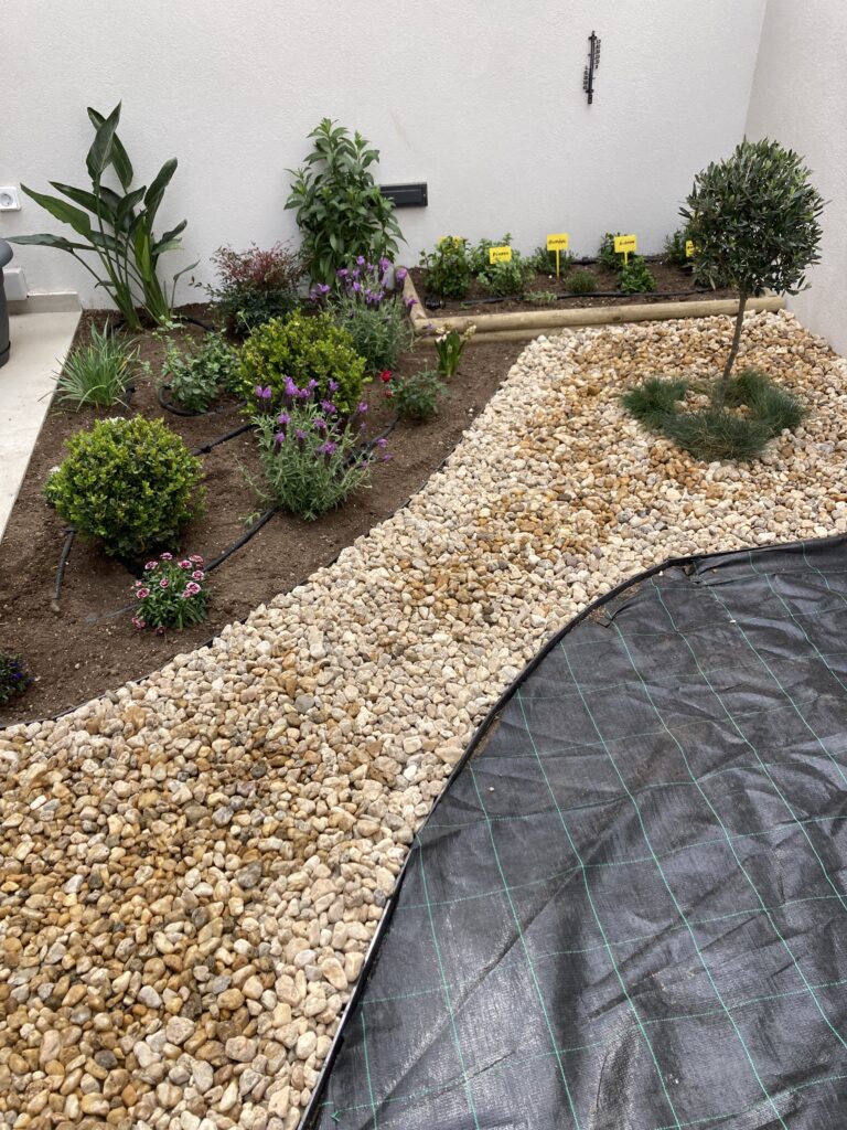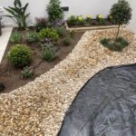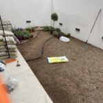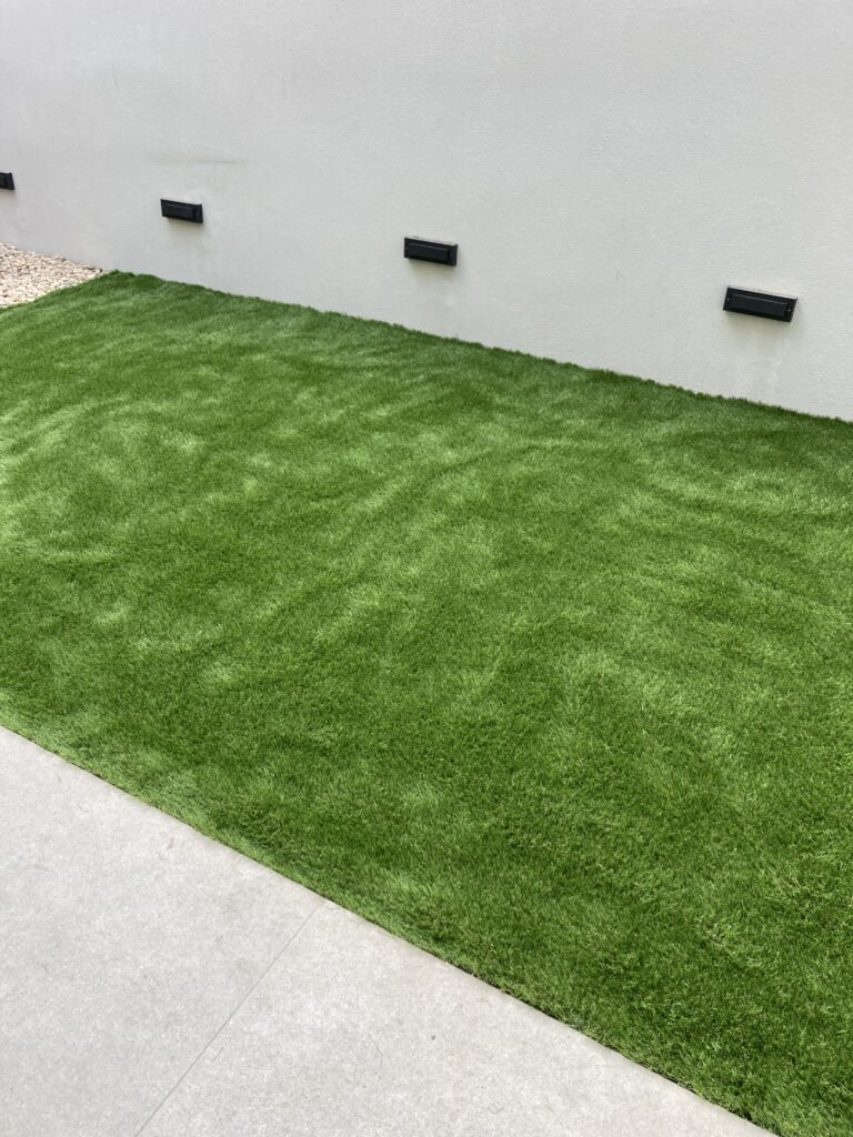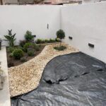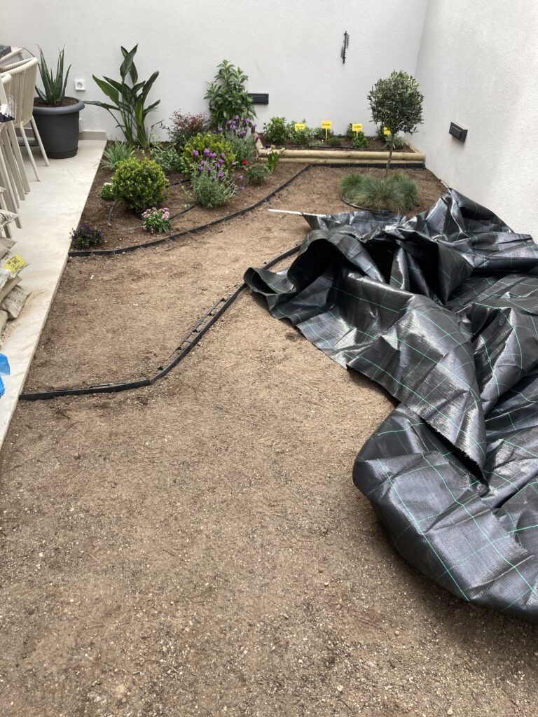 Οι διαστάσεις του κήπου μικρές, 2,8μ x 6,8μ, ωστόσο οι απαιτήσεις του ιδιοκτήτη μεγάλες για δημιουργία ενός εντυπωσιακού κήπου με τη λιγότερη δυνατή συντήρηση. Επιλέχθηκε συνθετικός χλοοτάπητας με ύψος ίνας 50mm, βότσαλο μπεζ χαλαζιακό, ανθοφόρα φυτά. Έγινε εγκατάσταση αυτόματου αρδευτικού συστήματος και επιπλέον, δημιουργήθηκε ένα μικρό υπερυψωμένο παρτέρι για την καλλιέργεια βασικών αρωματικών βοτάνων της ελληνικής κουζίνας.