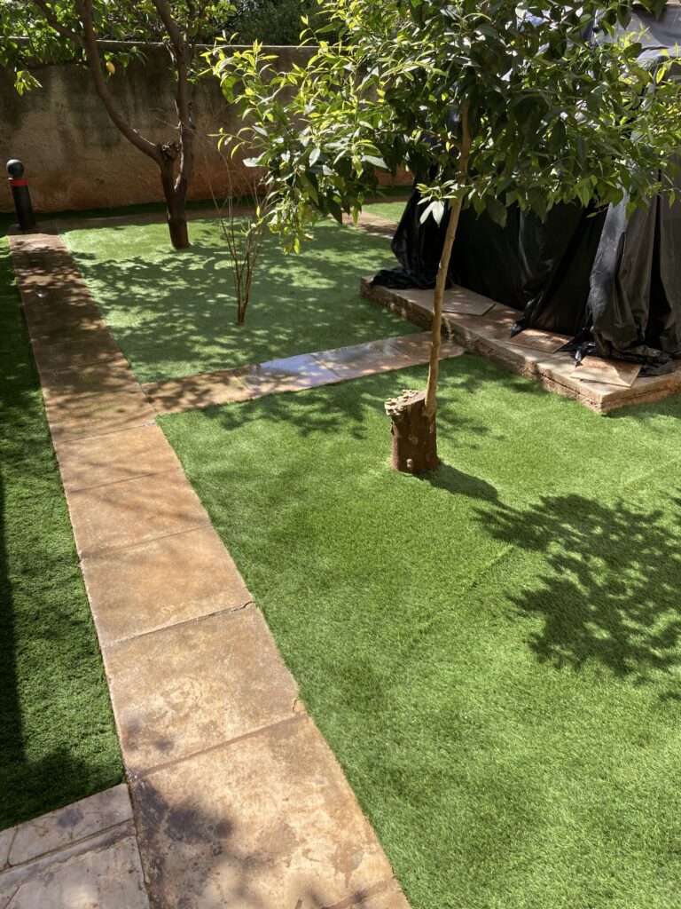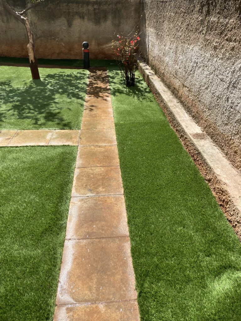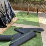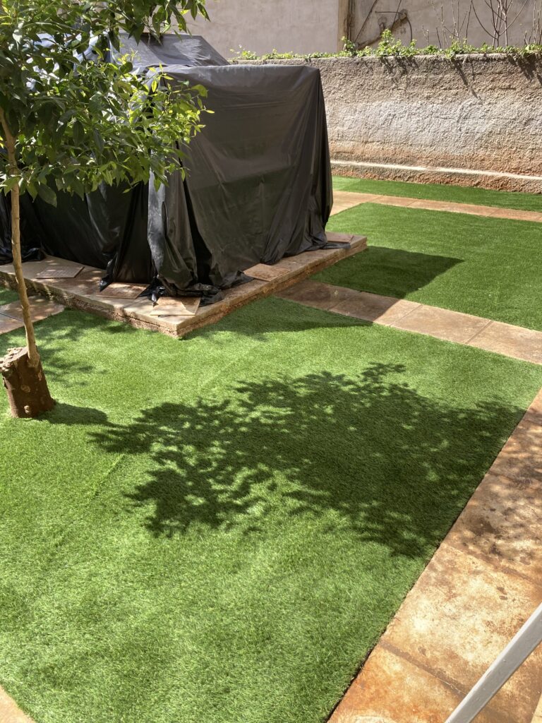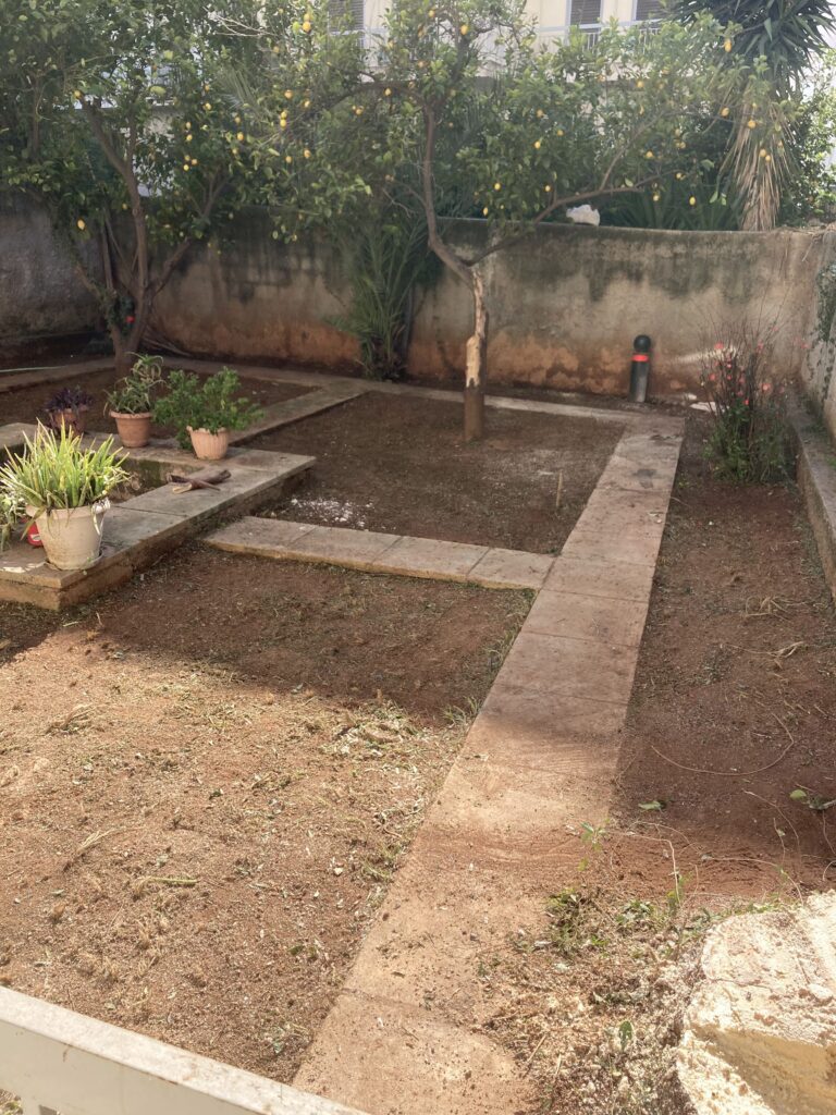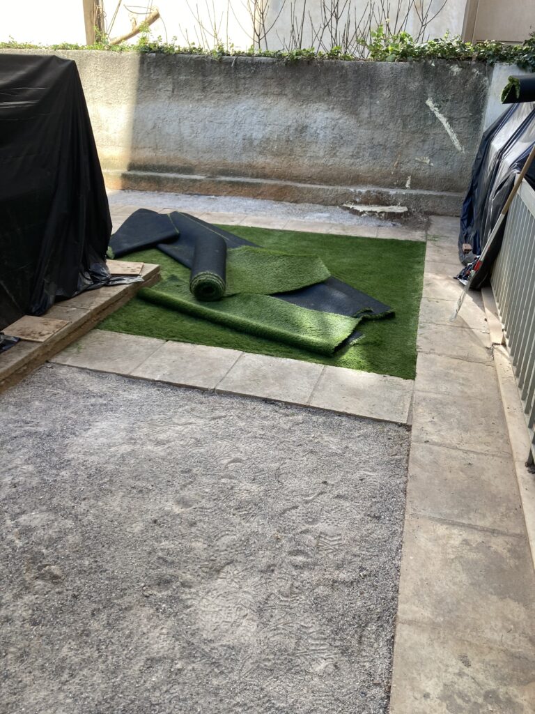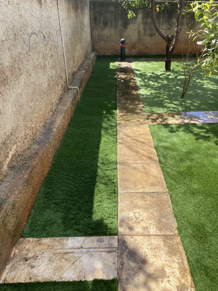 Ακάλυπτος χώρος πολυκατοικίας όπου τα ζιζάνια είχαν την “τιμητική” τους όλο το χρόνο. Έγινε επιμελής καθαρισμός του χώρου, κάλυψη με πανί εδαφοκάλυψης και εφαρμογή άμμου για κάλυψη των ανωμαλιών του εδάφους. Ακολούθησε διάστρωση συνθετικού χλοοτάπητα με ύψος ίνας 35 χιλιοστά.