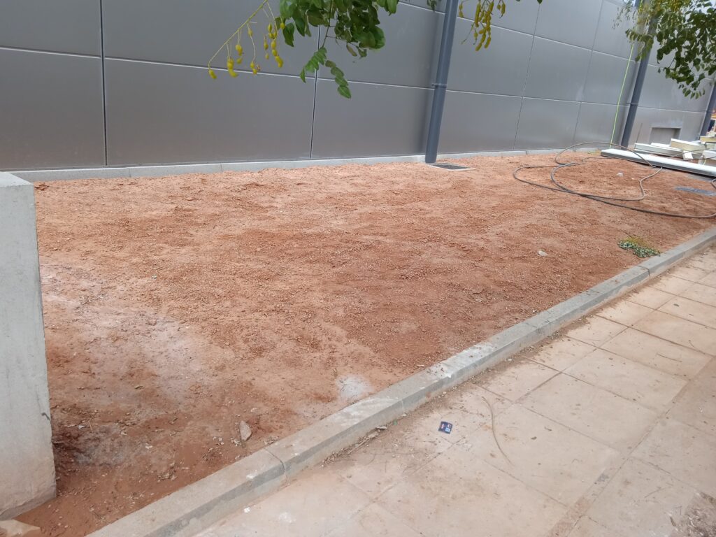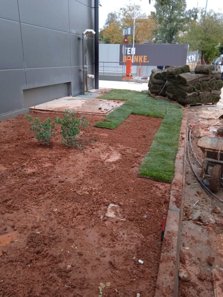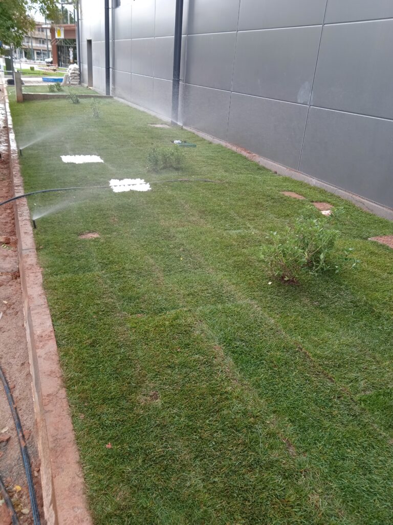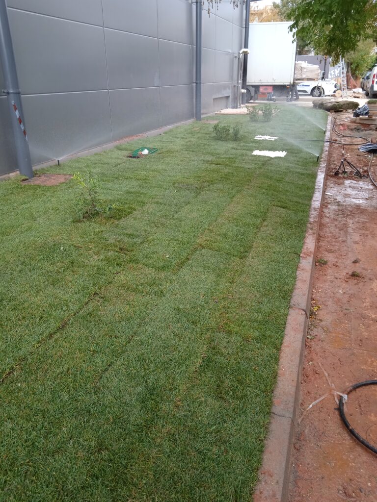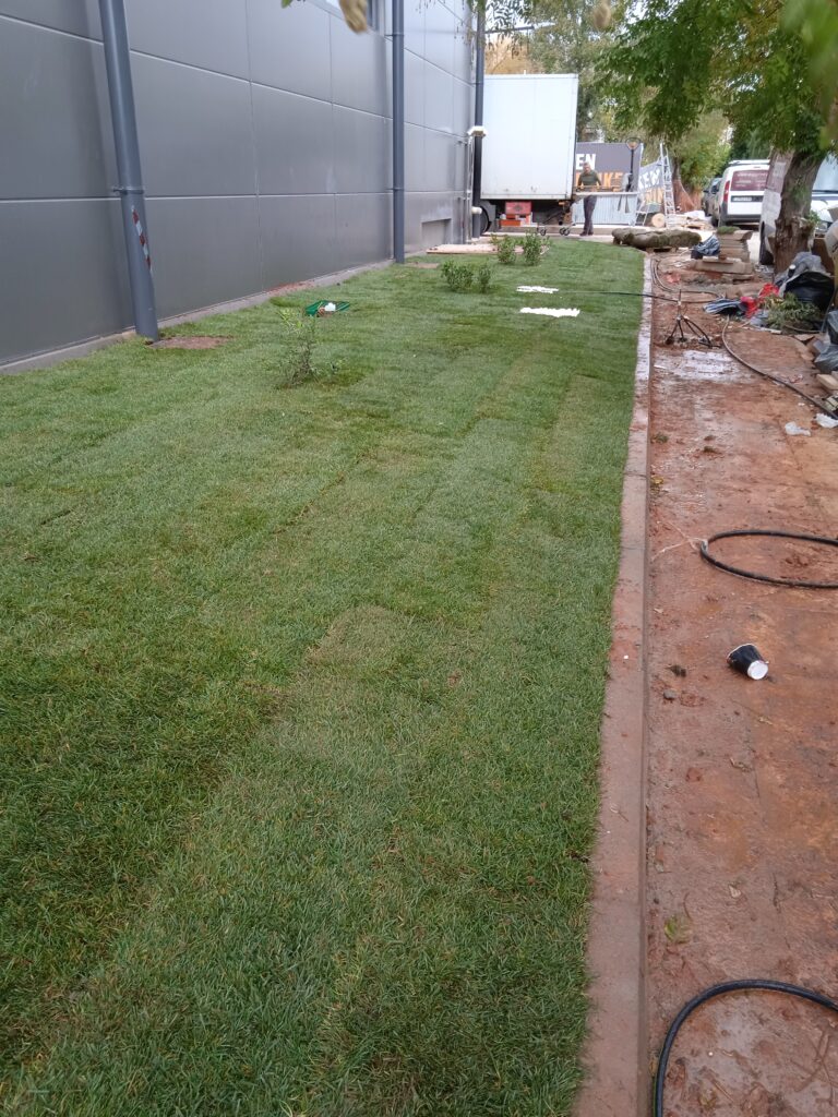 Διάστρωση έτοιμου χλοοτάπητα Μετά το φρεζάρισμα του εδάφους, έγινε εγκατάσταση υπόγειου αρδευτικού συστήματος και ακολούθως έγινε η διάστρωση έτοιμου χλοοτάπητα. Τηρήθηκαν αυστηρά οι προθεσμίες παράδοσης του έργου, μιας και μετά από δύο ημέρες έγιναν τα εγκαίνια του κτιρίου.