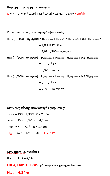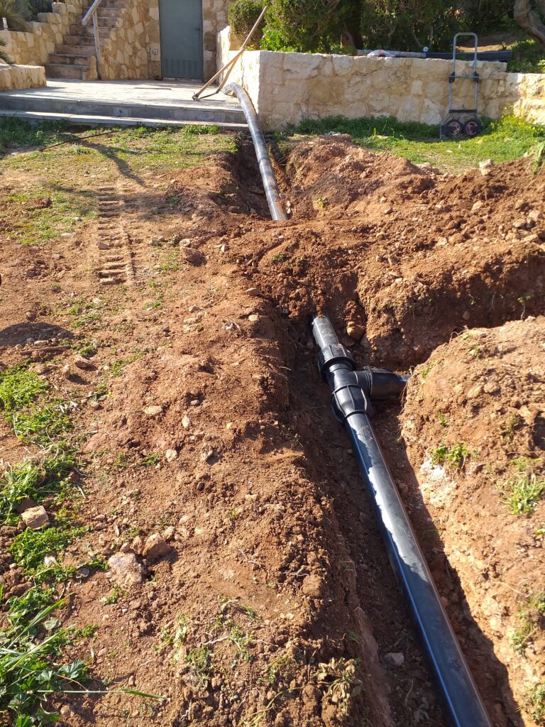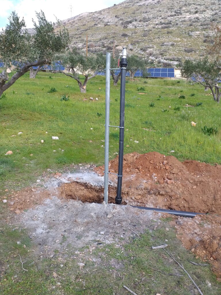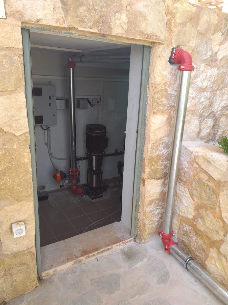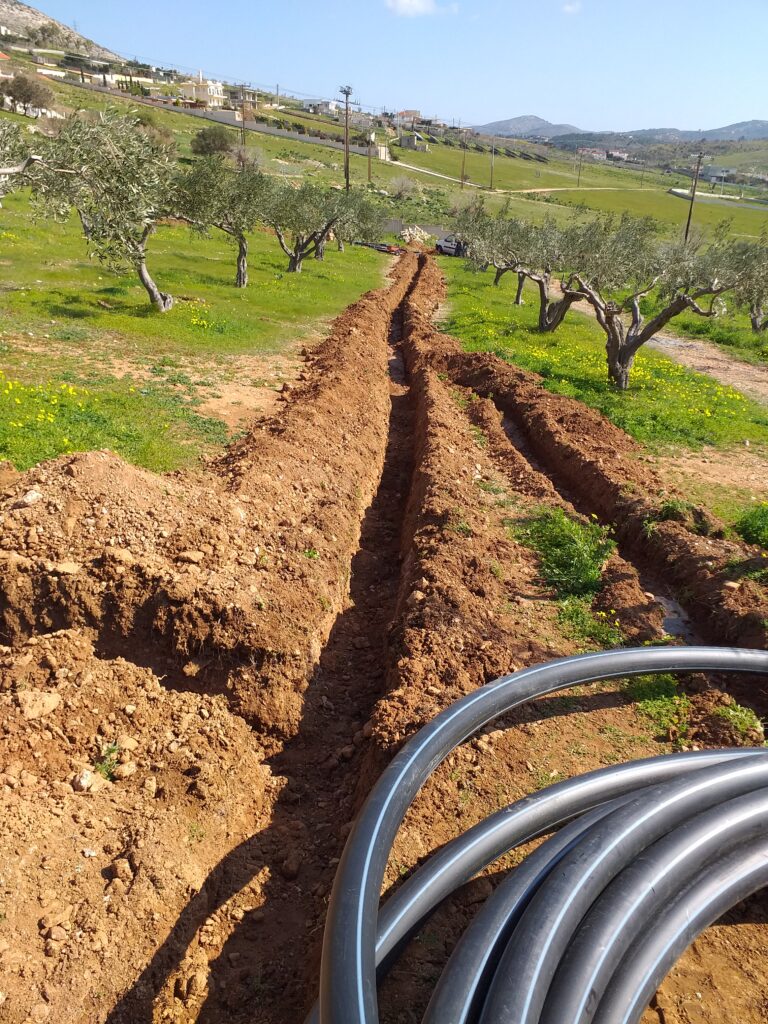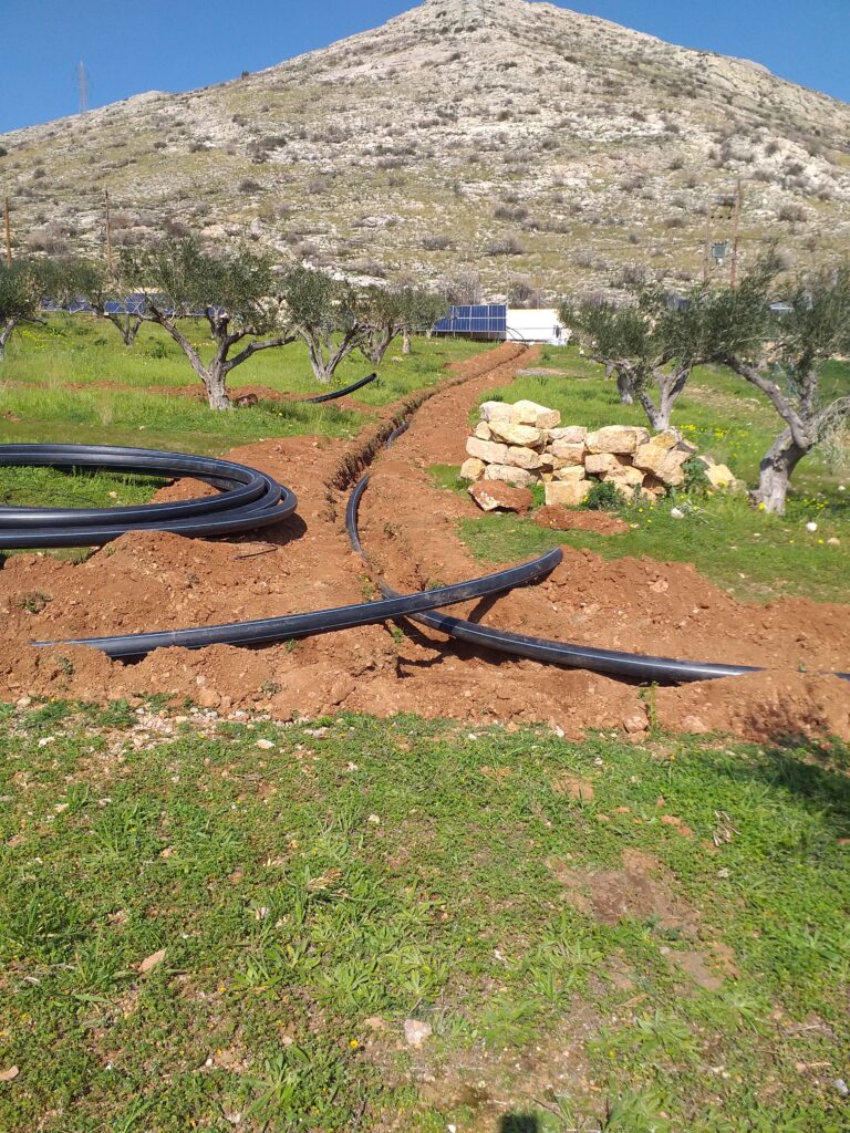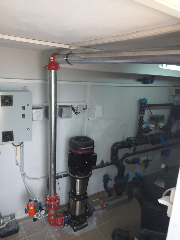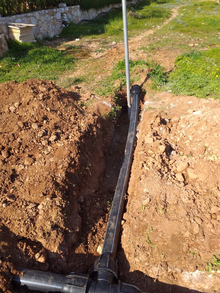 Μετά τη σύνταξη σχετικής μελέτης και την έγκριση της δαπάνης από τον ιδιοκτήτη, εγκαταστήσαμε υπόγειο σύστημα μεταφοράς του νερού με σωλήνα μεγάλης διατομής Φ110 και αντλία ανάλογης παροχής και μανομετρικού, η οποία και ανταποκρινόταν στις απαιτήσεις της αρχικής μελέτης.