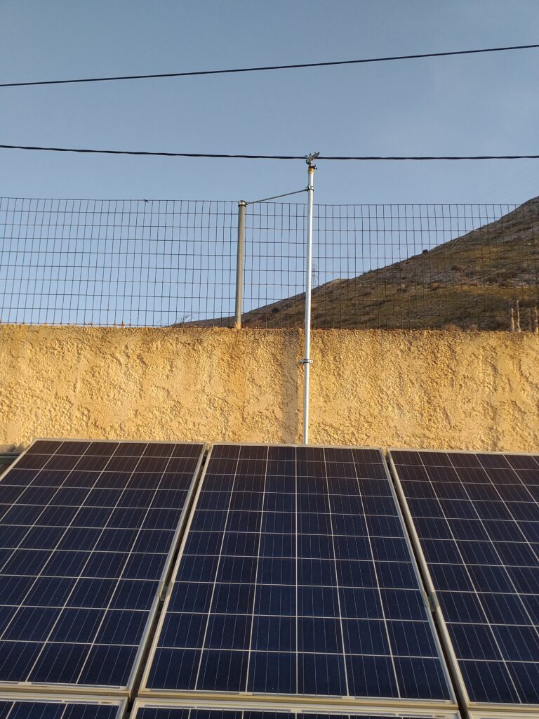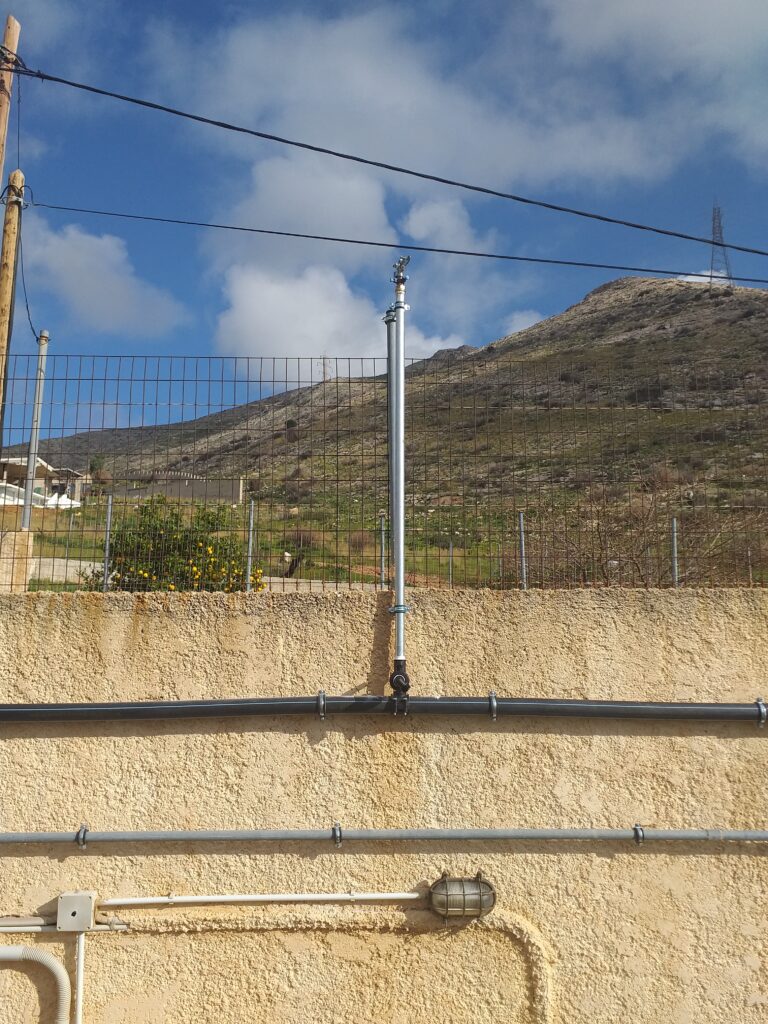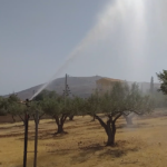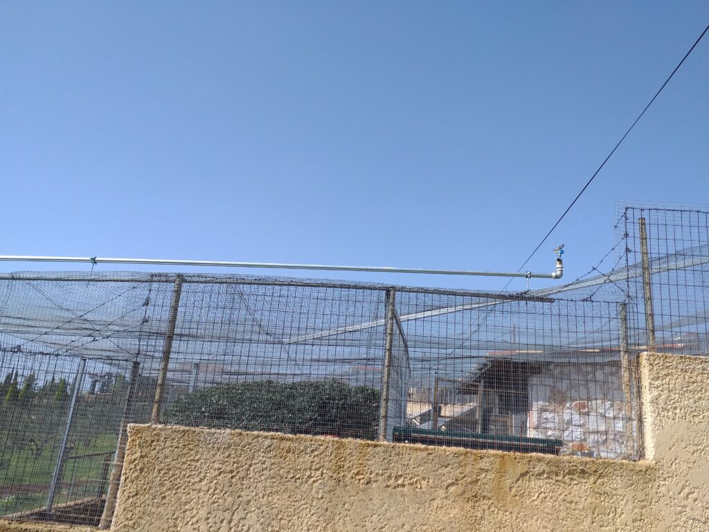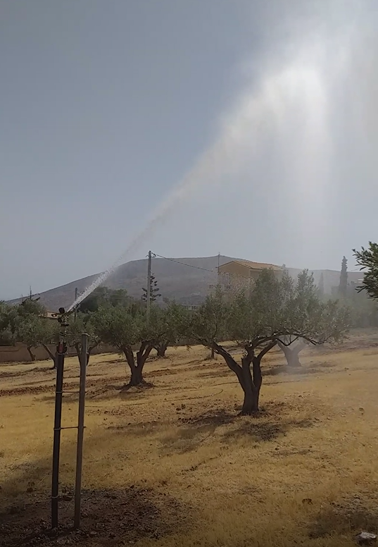 Περιμετρικά της μάντρας, τοποθετήθηκαν εκτοξευτήρες νερού για κάλυψη όλης της περιμέτρου και στο εσωτερικό του κτήματος εγκαταστήσαμε δύο εκτοξευτήρες νερού (τύπου κανόνι), οι οποίοι μπορούν να εκτοξεύσουν νερό σε ακτίνα 25 μέτρων (διάμετρος κάλυψης 50 μέτρα).